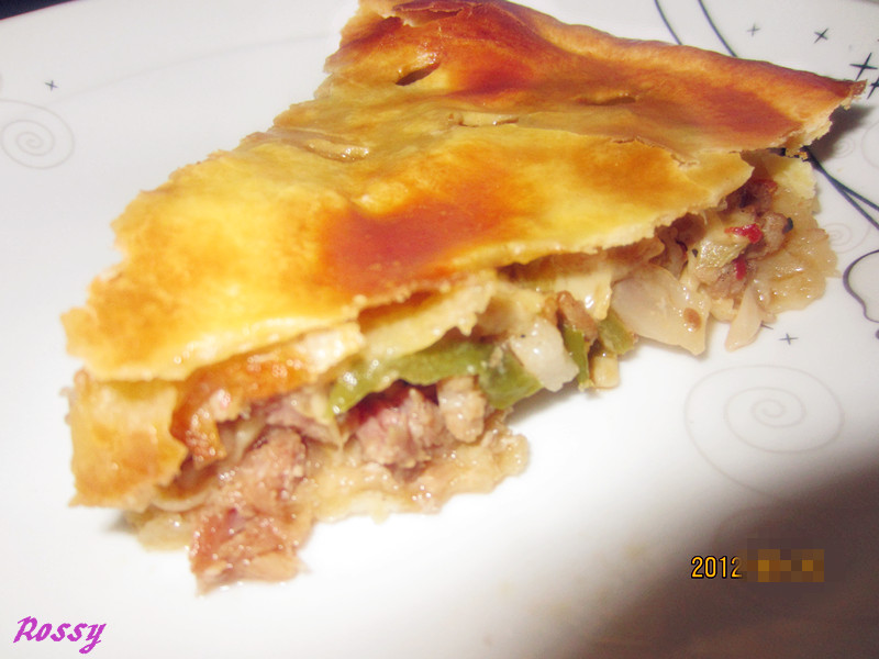 及以下步骤:入烤箱,200度,28分钟,中层,即可。要趁热吃哦~~ 面粉过筛后将黄油块放入其中,然后切拌的方式将黄油切碎,同时与面粉切拌均匀类似面包屑的形状。然后用手将其轻柔的搓均匀。 将蛋黄放入,再放入加了盐的牛奶或清水,一点点加,一点点切拌均匀,直至可以捏出不会裂开也不会很黏的面团,放进冰箱冷藏30分钟。 面粉过筛后将黄油块放入其中,然后切拌的方式将黄油切碎,同时与面粉切拌均匀类似面包屑的形状。然后用手将其轻柔的搓均匀。 将蛋黄放入,再放入加了盐的牛奶或清水,一点点加,一点点切拌均匀,直至可以捏出不会裂开也不会很黏的面团,放进冰箱冷藏30分钟。 将所有的肉,菜丁,酱啊等等内陷除了芝士,混合在一起搅拌均匀即可。 取3分之2的面皮先用擀面杖擀平成圆形,不能太薄,大概有个0.3,0.4厘米。然后放进模具中,用手轻压,边缘也要留一些,使其松弛15分钟,然后在上面包括边缘抹上一层蛋黄液。 把馅料放入,芝士放最上面。 将剩余的派皮擀平且很薄,然后搭在上面,将边缘轻压使其粘黏稳,然后再在上面抹上一层蛋黄液,然后用剪刀剪一些小孔,在抹上一层蛋黄液。 入烤箱,200度,28分钟,中层,即可。要趁热吃哦~~
