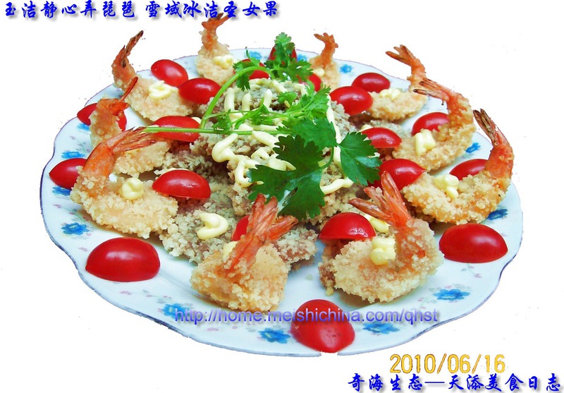 【牛肉与虾的交响曲】——玉洁静心拢琵琶 雪域冰洁圣女果 每逢国定长假 亲人团聚少不了设宴庆贺,设宴就少不了油炸类菜式,可家宴专为儿童配置的油炸类菜式,还是比较少见,节日期间为了孩子解馋,往往多会外带些香料十足的油炸类食品,虽说油炸类食品不健康,可目前市场油炸类食品的油脂五花八门,隐藏着许多更不健康的因素...... 为此,特为亲们和孩子们创意了一道,极其简单的,用平时大家喜欢的普通食材冰牛肉、大虾、圣女果和香菜等食材制作的【家宴花色拼盘】——《玉洁静心拢琵琶 雪域冰洁圣女果》,希望能为亲们节日宴席,给孩子们增添一道色似冰洁雪域,形似点点心红琵琶胧月,比较健康的油炸类花色拼盘菜肴。 菜式特点: 1、菜式呈现,冰洁雪域仙女下凡拢琵琶之场景,色调、形态高雅宁静.... 2、口感丰富,‘雪域孜然小牛排’麻辣孜然味,‘冰洁凤尾琵琶虾’葱香胡椒味,配以圣女果、香菜、沙拉酱或炼乳口感微妙之极...... 3、营养丰富,搭配合理,牛肉与大虾两种蛋白相距较远,能被人体充分吸收,两种蛋白同时摄入,不易产生营养过剩,拼盘中圣女果、香菜均是炸虾和牛排最佳拍档,且能有教地补充维生素、纤维素等.特别有益于生长发育期儿童...... 现将【家宴花色拼盘】—— 《玉洁静心拢琵琶 雪域冰洁圣女果》食材配置图解上传与亲们分享,希望能为亲们家宴增添一丝新意! 愿,美食常伴左右,人人福寿安康!