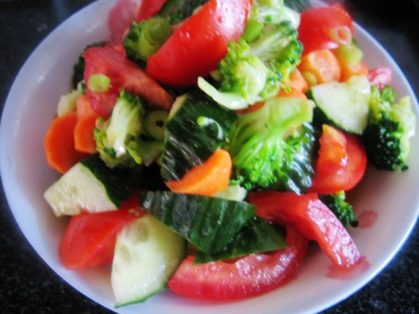盐(适量) / 糖(适量) / 香油(适量) / 蒜(适量) / 胡萝卜(适量) / 西红柿(适量) / 黄瓜(适量) / 香葱(适量) / 苹果醋(适量) / 凉拌酱油(适量)