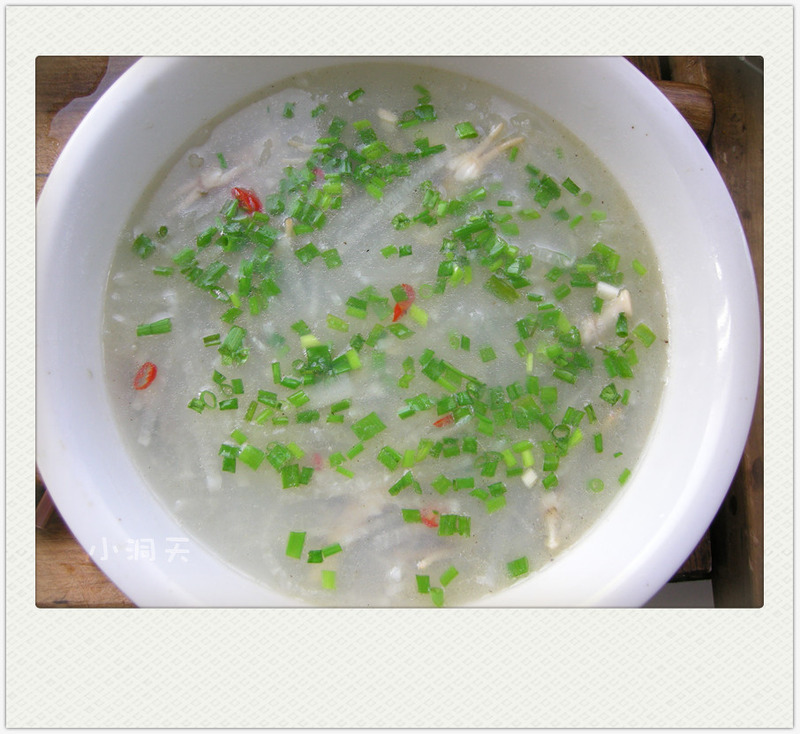 及以下步骤:加入食材,开水,打去浮沫,加少许咸盐烧开即可出锅。 出锅装碗,洒少许香葱。 新鲜蛏子200克。 用淡盐水浸泡两个小时。 萝卜切细丝下开水锅略烫。别忘了放少许咸盐。不是入味,只是为了去除萝卜的青杂气。 蛏子洗净后入锅略烫。 蛏子肉和烫好的萝卜丝。 大油少许,只是为了味道更加鲜美。 加入食材,开水,打去浮沫,加少许咸盐烧开即可出锅。 出锅装碗,洒少许香葱。