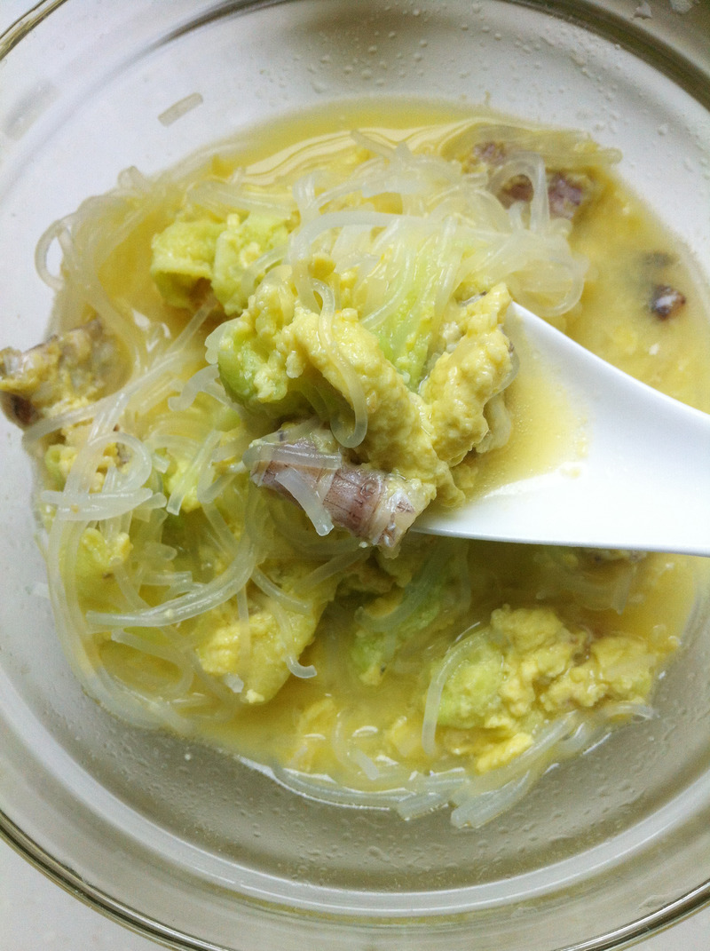 及以下步骤:平剖鲜萝卜,小勺刮蓉 薄薄清香的萝卜蓉 虾虎肉切段,磕入鸡蛋 搅拌均匀,撒少许盐 热油锅倒入搅拌好的食材 加少许水,小火,铲子推别糊锅底 放入粉丝,鸡蛋稍凝结就关火,汤中再撒少许盐 出锅了 放入粉丝,鸡蛋稍凝结就关火,汤中再撒少许盐 出锅了
