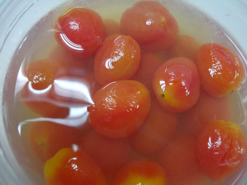 6、将步骤4里面已经剥皮的圣女果浸渍在步骤5已经冷却的梅子糖水里。放到冰箱浸渍半天,时间越长味道越好。