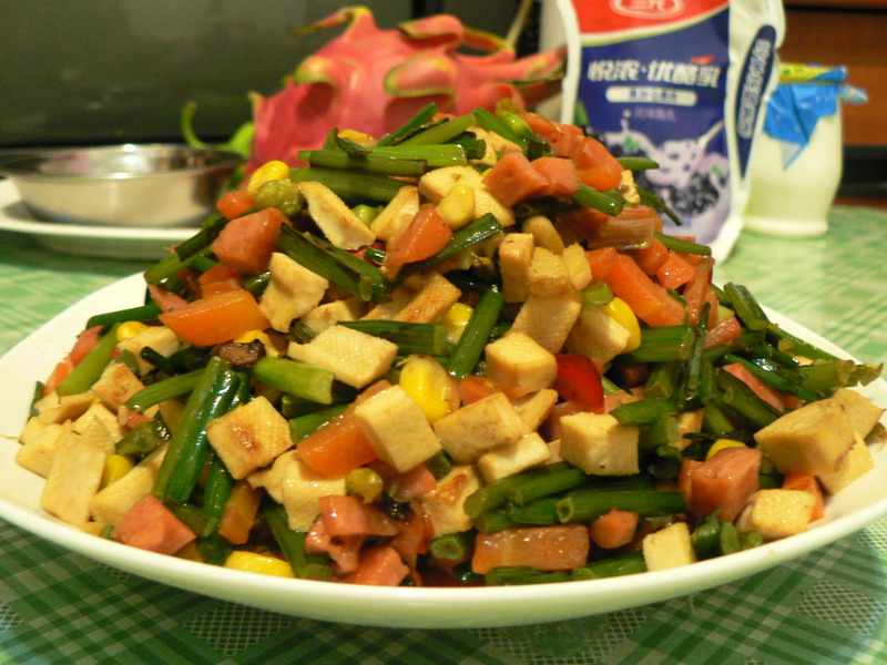胡萝卜(半只) / 火腿(半个) / 白豆干(4片) / 玉米粒(适量) / 韭菜苔(1把)