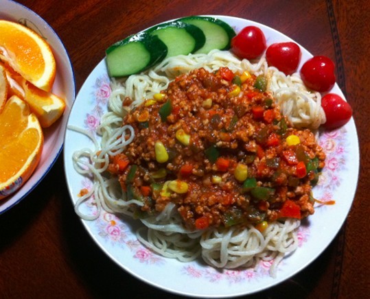 意大利面,又称之为意粉,是西餐品种中最接近中国人饮食习惯,最容易被接受的。关于意大利面条的起源,有说是源自古罗马,也有的说是由马可·波罗从中国经由西西里岛传至整个欧洲的讲法。 意大利面的酱料基本来说可分为红酱和白酱,红酱是用番茄为底的红色酱汁,白酱则是由面粉、牛奶及奶油为底的白酱汁,此外,还有用橄榄油调味的面和用香草类调配的香草酱。(摘自百度) 想吃意大利面,附近又没有正宗的意大利面店,怎么办~? 自己动手~ 怕麻烦? 没关系! 10分钟让你吃上味道正宗的意大利面~ 准备材料:鲜面条(或通心粉)、青椒、玉米、胡萝卜、猪肉(或牛肉)摆盘用的小蕃茄 等若干。 配料:地们青椒蘑菇意大利粉酱,盐,橄榄油。