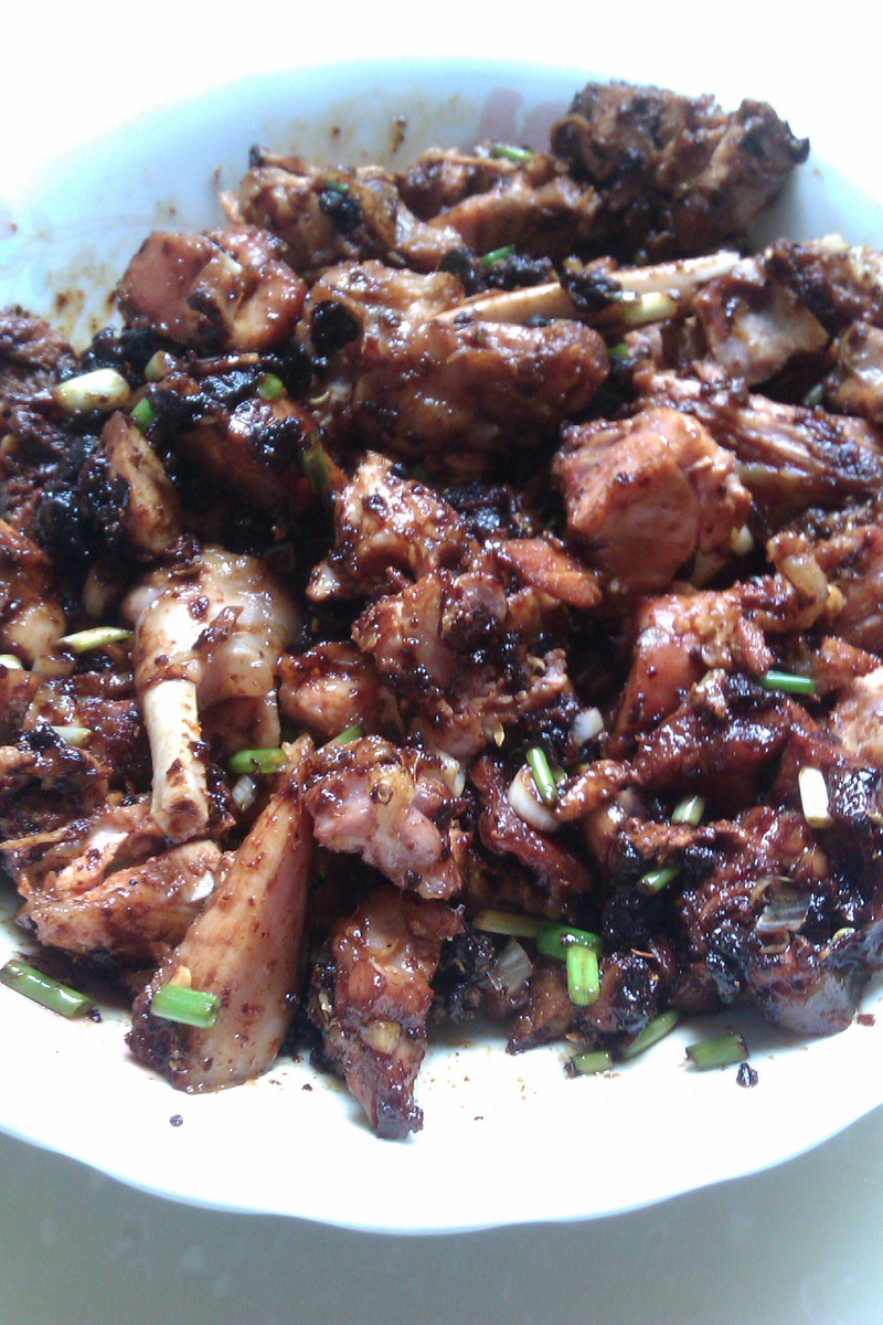 4、把豆豉连同豆豉油一同淋在兔丁上,放糖、味精、辣椒油,花椒、老抽,葱花拌均即可食用了。