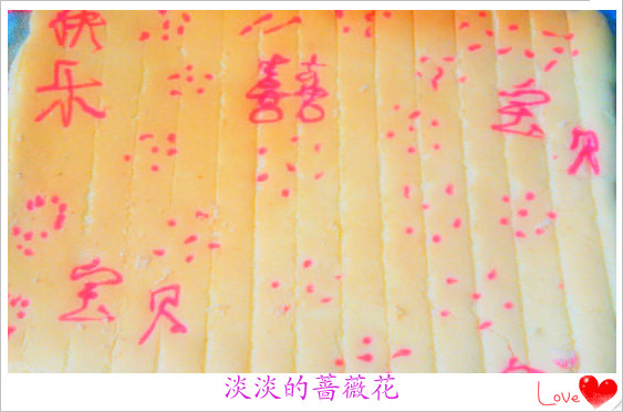 7、7、将烤盘里放平烤纸,倒入调好的面糊。表面挤上用色素调好的糊写上快乐等字样。。以示庆贺。。