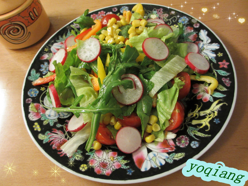 及以下步骤:将切好的食材装入盘中。 将所有食材洗净,冰山生菜、甜椒、番茄、樱桃萝卜切片。 将切好的食材装入盘中。 将所有食材洗净,冰山生菜、甜椒、番茄、樱桃萝卜切片。 将切好的食材装入盘中。 将所有食材洗净,冰山生菜、甜椒、番茄、樱桃萝卜切片。 将切好的食材装入盘中。 将所有食材洗净,冰山生菜、甜椒、番茄、樱桃萝卜切片。 将切好的食材装入盘中。 倒上沙拉醋再撒上玉米粒。