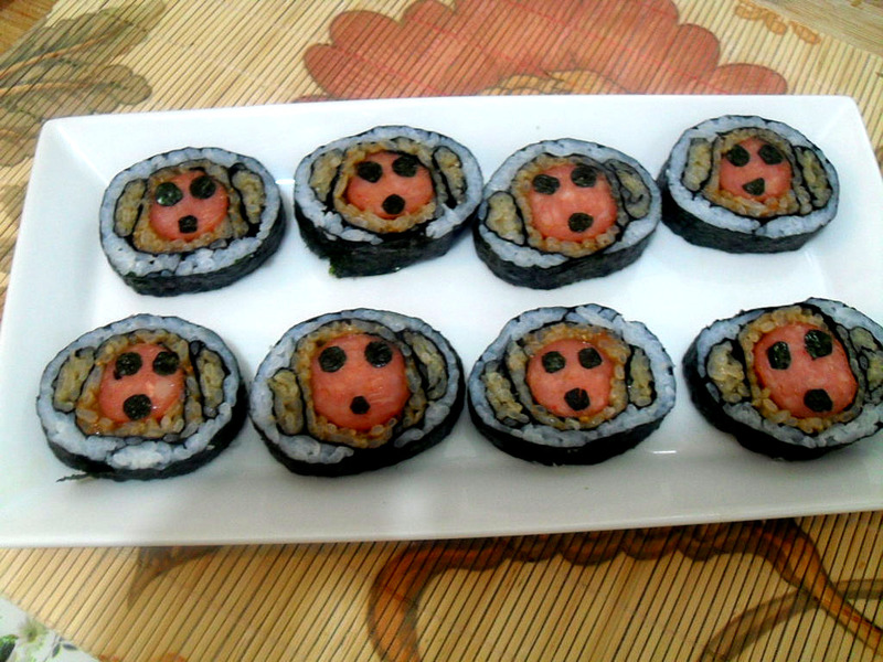 用做普通的寿司剩余的米饭又做了个花样的寿司,可做完后,就失望,在卷寿司压的的扁了,导致我做的小熊的耳朵变成竖着的了,还有白米饭不够了,小熊的鼻子就变成脸了。看着有的像猴子,有的像小狗。