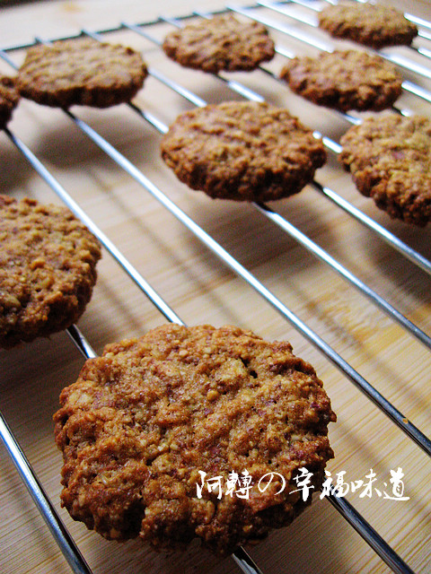 做法来自蘑菇酱。,主打的是无油无粉做饼干。她的原方子里都是以cup、tsb做计量单位的,我就大概参考了一下,没有完全按照她的量,做出的成品也不错。 这个饼干使用的材料很少,花生酱里面已经有油了,所以就不用再放了。面粉也不需要,用燕麦片即可。做法也极其的简单,只要把材料混合一下就行,不需要搅拌打发,随便整一下形状就能烤了。从开始准备,到吃到嘴里,半小时足矣。花生酱的香气配上燕麦片的口感,味道那是相当不错。我用的是自制的颗粒花生酱,吃起来更有咬劲。