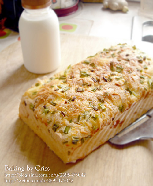 家里有两颗鸡蛋白,做了咖啡冰淇淋以后剩下来,躺在厨房的角落,静静的发呆。 趁着没有人问津,蛋白小米问蛋白小黄:你说我们还能干嘛? 小黄说:用处可大了,可以做天使蛋糕,可以做马卡龙。 蛋白小米叹了口气:哎,天使蛋糕,criss没有空心模啊。至于马卡龙,criss一家都不喜欢太过甜腻的味道。 小黄也叹了口气:criss会不会忘记我们了呢,等我们慢慢变坏,就会像扔垃圾一样把我们扔进青蛙垃圾桶的嘴里。 青蛙垃圾桶嘴里露出饼干袋,邪恶的一笑:来呗来呗,和我做个伴呗,不用多久,你们也会到这儿来的。 两颗鸡蛋白使劲的摇头,大声呼喊:criss,救救我们吧~~~~~~~ 我喜欢做不一样的烘焙,因为往往在尝试中,能发现很多甜蜜惊奇的乐趣,也许这就是我对烘焙这么多年来始终兴趣不减的最大原因。当家里的aca烤箱第一次来到我家,坐在阳台,连戚风在烤箱里的膨胀都让人兴奋并且快乐起来。 家里有多余的鸡蛋白,又没有空心蛋糕模的时候,一起来做一款甜中带咸的葱香芝士咸味蛋糕吧,当然,如果你和我一样,喜欢同一种食物里有着多种相悖的味道。