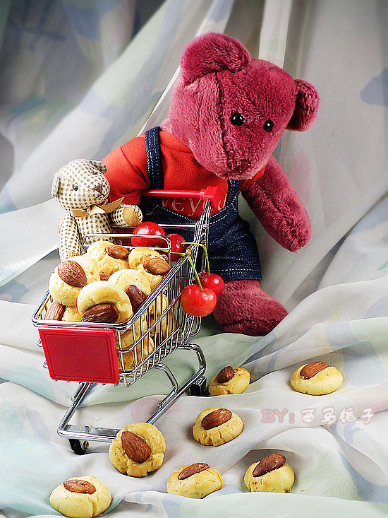 及以下步骤:用手揉合成光滑的面团,包上保鲜膜,放入冰箱冷藏30分钟。 取出冷藏好的面团,分别搓成10克左右的圆球状,码放在烤盘里。 将杏仁豆放在面团正中间,用手指按扁。 表面上刷一层蛋白液。 烤箱预热 170度。 入烤箱中下层,设置上下管加入烘烤,10分钟。再改为热风循环烘烤,10分钟上色。关闭烘烤设置,再焖10分钟,共30分钟。 将杏仁豆放在面团正中间,用手指按扁。 表面上刷一层蛋白液。 烤箱预热 170度。 入烤箱中下层,设置上下管加入烘烤,10分钟。再改为热风循环烘烤,10分钟上色。关闭烘烤设置,再焖10分钟,共30分钟。