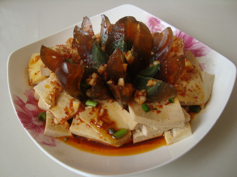 6、香辣汁浇在豆腐和皮蛋上,撒点小葱末作点缀。