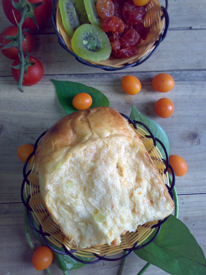 当圣女果遇到奇异果,原来吃起味道也是很般配的,不过都是生产果脯的厂家的功劳,把味道各异的两种水果硬是搞得差不多。就好像性格不同的一对男女阴差阳错的结了婚,时间长了,不是你妥协就是我委就,双方磨合好的还可以过下去,当然也有例外的,例外那些就一拍两散啰! 我今天有点啰嗦,写的过程很详细,希望看的人不嫌烦就好了。 此款杂果吐司为中种法。