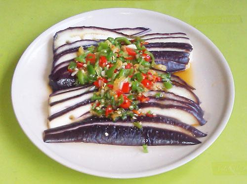 及以下步骤:茄子洗净切条,下锅蒸 一般十来分钟吧(用筷子轻轻一插就过去就差不多熟啦) 茄子洗净切条,下锅蒸 一般十来分钟吧(用筷子轻轻一插就过去就差不多熟啦) 茄子洗净切条,下锅蒸 一般十来分钟吧(用筷子轻轻一插就过去就差不多熟啦) 茄子洗净切条,下锅蒸 一般十来分钟吧(用筷子轻轻一插就过去就差不多熟啦) 泡椒剁细,加蒜泥和一点盐一起过油,油稍微多一点 泡椒和蒜泥香气出来后就可以一起淋到蒸好的茄子上了