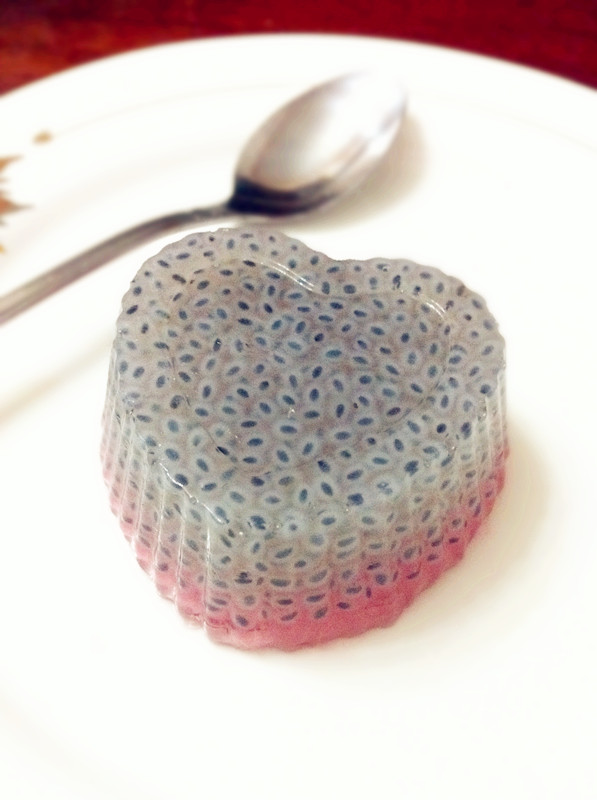 6、第一层南眉籽果冻结住,用手指轻触表面没有手印后,倒入草莓果冻水