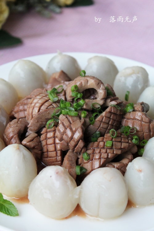 及以下步骤:倒入调好的汤汁炒几下,等汤汁烧滚后放葱花即可起锅。(全程无需盖锅盖,防止腰花变老) 荔枝剥壳围在腰花边上一圈,即美观,又可当餐后水果。 将猪腰子片净腰臊部分,用刀在表皮切出十字花刀,一般我们菜场里买来都给处理好的。 将猪腰子洗净切成小块,加盐、料酒、生姜腌制十分钟,这样可以去腥味。 将白糖、醋、生抽、料酒、味精、湿淀粉调成汤汁。 起油锅,放入葱白和大蒜子爆香。 连汁倒入腌制后的猪腰。 翻炒几下。 倒入调好的汤汁炒几下,等汤汁烧滚后放葱花即可起锅。(全程无需盖锅盖,防止腰花变老) 荔枝剥壳围在腰花边上一圈,即美观,又可当餐后水果。