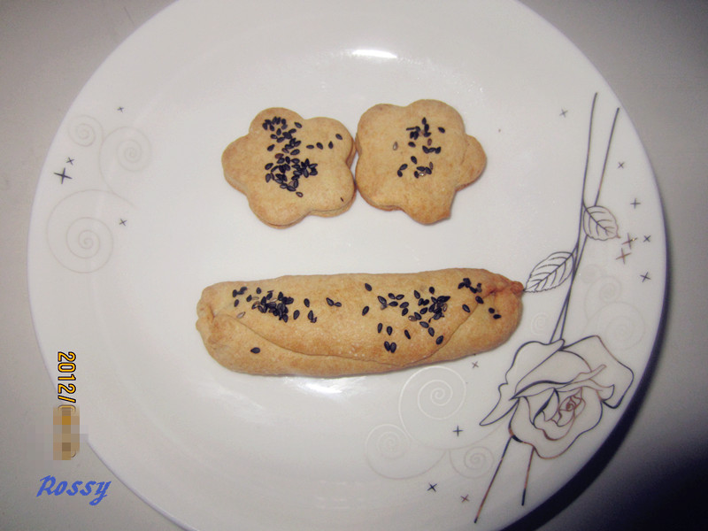 及以下步骤:烤箱预热170度,烤盘上垫上锡箔纸,锡箔纸上轻轻刷好油,放上饼干,入烤箱。25分钟,170度,中层,上下火。 将黄油室温软化,然后打发至膨胀就放入绵糖和芝麻酱,搅拌均匀。 然后加入一个鸡蛋搅拌均匀,再把低筋高筋面粉筛入,切拌均匀,呈现屑状但是又捏的成形状。 将黄油室温软化,然后打发至膨胀就放入绵糖和芝麻酱,搅拌均匀。 然后加入一个鸡蛋搅拌均匀,再把低筋高筋面粉筛入,切拌均匀,呈现屑状但是又捏的成形状。 轻柔成面团后用保鲜袋封好放入冷藏半小时。 将肉松,腰果放入保鲜袋中用擀面杖压碎。 将面团取出后,取一块用擀面杖压平整,要薄,然后将肉松腰果碎和黑芝麻放再中间一条,然后挤上三排沙拉酱。 然后从两边盖被子一样的辙好,另外两边用手指轻轻掐好即可。 烤箱预热170度,烤盘上垫上锡箔纸,锡箔纸上轻轻刷好油,放上饼干,入烤箱。25分钟,170度,中层,上下火。