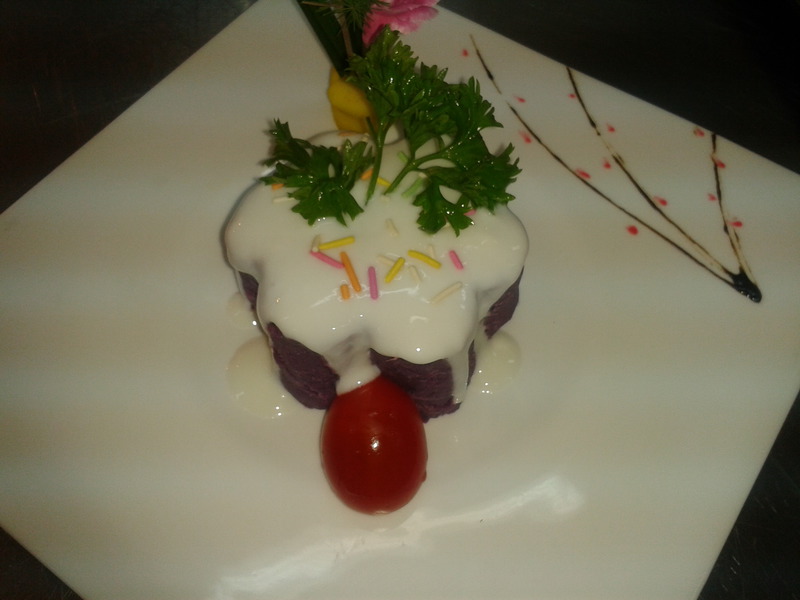 及以下步骤:去皮,用手抓成泥 紫薯蒸熟 去皮,用手抓成泥 紫薯蒸熟 去皮,用手抓成泥 紫薯蒸熟 去皮,用手抓成泥 紫薯蒸熟 去皮,用手抓成泥 加入炼乳,拌匀,用模具扣出,浇上酸奶,点缀薄荷头