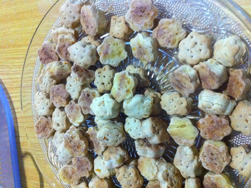 及以下步骤:面团冷藏两小时后擀成薄面饼,用磨具刻出形状,然后用叉子在上面叉小孔透气。这里我就预感到饼干要失败了,因为花朵造型放到烤盘上就开始变形了,仿佛面片萎缩变形,高手看到了请指点一下。 原菜谱是190度,放在中上层,烤10分钟。我家的小烤箱也没有上中下之分,但是8,9钟的时候就已经这样了我赶快拿出来,看来温度是一定要跟自家烤箱结合的。 橙子把最外面的薄皮刨下来,最好是用刨西红柿皮的那种刀,这样会很薄不会弄到白色的皮。橙子最好先用盐洗一下,怕有农药啊打蜡啊什么的。 用料理机磨成细末。刀切也可以,就是麻烦一点了。 去皮后的橙子榨汁 橙汁过滤,不要果肉只要汁 过滤后的橙汁中加入面粉,酵母粉和小苏打,拌匀揉好 揉好的面团。估计失败就是在这一步,不知道是不是因为揉过度了。揉好面团冷藏2小时。 面团冷藏两小时后擀成薄面饼,用磨具刻出形状,然后用叉子在上面叉小孔透气。这里我就预感到饼干要失败了,因为花朵造型放到烤盘上就开始变形了,仿佛面片萎缩变形,高手看到了请指点一下。 原菜谱是190度,放在中上层,烤10分钟。我家的小烤箱也没有上中下之分,但是8,9钟的时候就已经这样了我赶快拿出来,看来温度是一定要跟自家烤箱结合的。