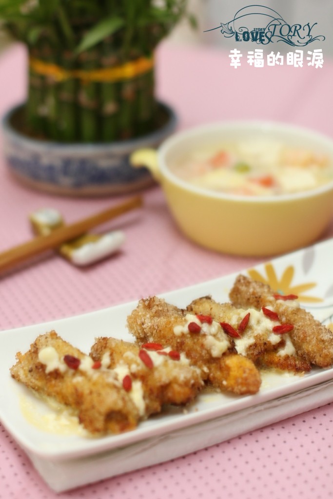 胡椒粉(适量) / 盐(适量) / 面包糠(适量) / 鸡蛋(一个) / 面粉(适量) / 沙拉酱(适量) / 橙汁(一个)