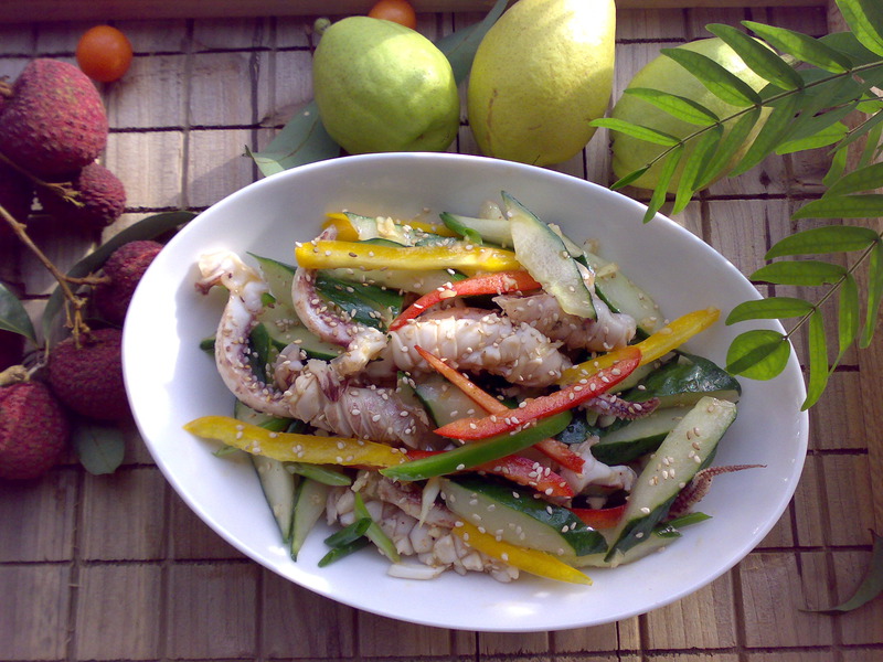 及以下步骤:鱿鱼先切菱形花纹,再切小件 黄瓜切小片 鱿鱼先切菱形花纹,再切小件 黄瓜切小片 鱿鱼先切菱形花纹,再切小件 黄瓜切小片 葱切斜小段,蒜切碎 三色彩椒切丝 鱿鱼用放了油盐酒烧开的水稍焯卷起 把所有主、配料和调味料混合在一起,最后洒上熟芝麻,即成