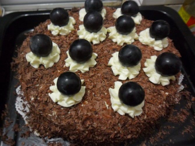 及以下步骤:蛋白加入白砂糖打至硬性发泡。 取3分之1的蛋白加入到蛋黄糊里,上下搅拌均匀。 搅拌好的样子。这个时候要把烤箱预热160度。 然后把搅拌好的蛋黄糊到进剩下的3分之2的蛋白中,搅拌均匀,倒入8寸的模具中。然后放入预热好的烤箱中烤45分钟,烤箱的温度根据自己的烤箱调节。 这个是烤好的蛋糕胚 把淡奶油打发好,然后把蛋糕片成3片,先取一片,抹上一层淡奶油然后加一圈葡萄,然后再加一片蛋糕,再摸一层奶油,再铺一圈葡萄。 最后加一片蛋糕,用淡奶油把整个蛋糕都抹好。 最后把巧克力用勺子削成巧克力屑,抹到蛋糕上,裱花,装饰葡萄,放冰箱冷藏一晚上即可。冷藏了风味更佳。 成品 开动喽!