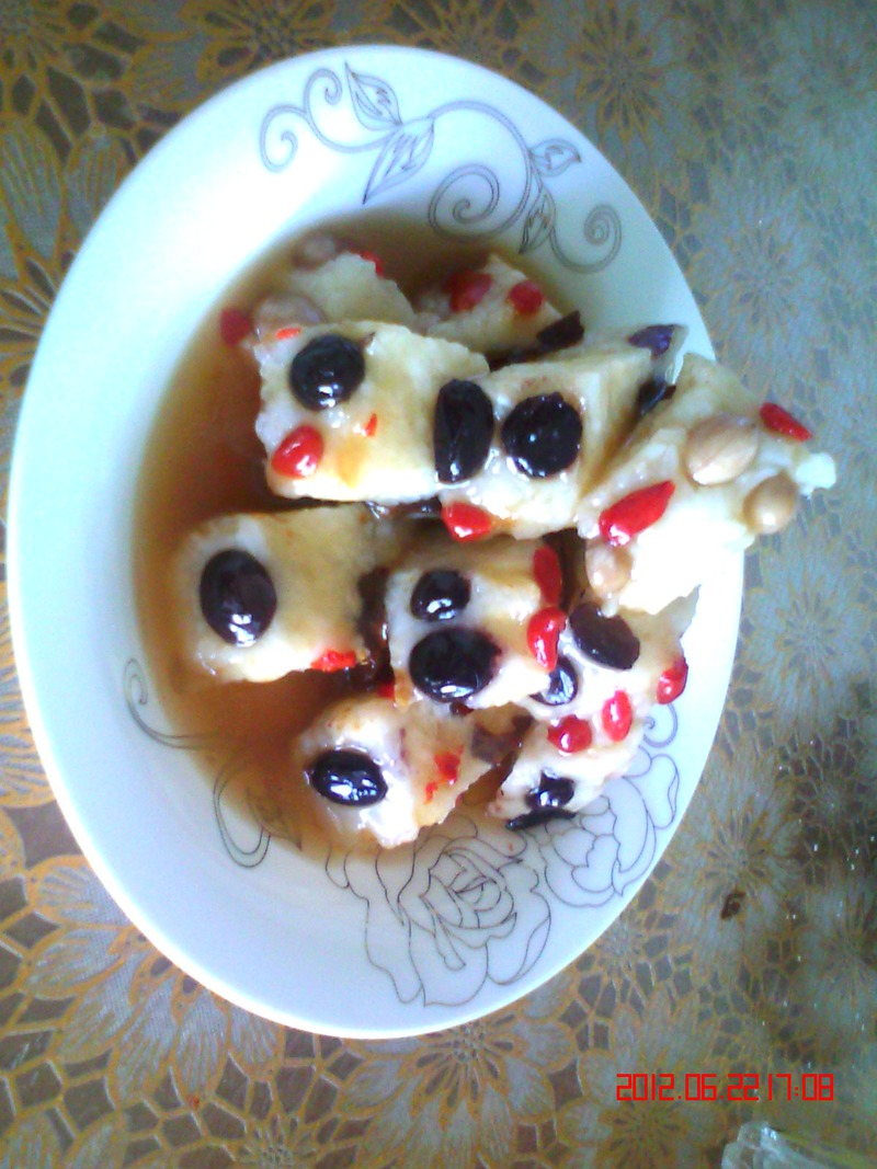 白糖或蜂蜜(适量) / 花生 葡萄干 枸杞(适量)