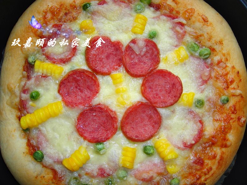及以下步骤:继续翻炒成粘稠的西红柿酱,加入盐后,即可出锅装入碗中备用 将高粉低粉白糖盐奶粉放入盆中搅拌均匀,温水化开酵母,和成面团,放入面包机中,揉到扩展阶段 面团室温发酵1个小时到变成2倍大,手指蘸面戳面团中间,面团不回缩就好 把发酵后的面团挤出空气,分成2份(制作9寸),室温下醒发15分钟 用擀面杖擀成9寸大小的圆形面饼 用手掌按成中间薄边缘后的饼 烤盘底部放油纸,放上面饼,用叉子将中间部分扎小孔,饼上刷一层玉米油,室温发酵20分钟 用刀将香肠切片,玉米剥粒,青豆洗净 马苏里拉芝士炮成丝 烤箱中层预热180度,上下火,烤15-20分钟即可
