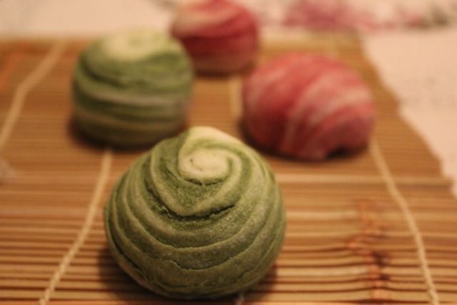 及以下步骤:包入内陷 包入绿茶馅,收口,整形 烤箱180度 25分钟左右 烤箱 180度,20分钟左右 从中间切开 由螺旋处压扁平,擀成外皮 包入内陷 包入绿茶馅,收口,整形 烤箱180度 25分钟左右 烤箱 180度,20分钟左右