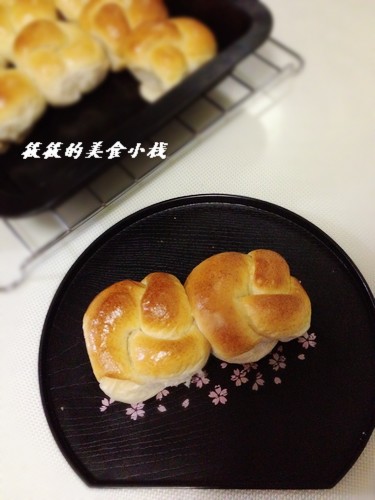 及以下步骤:卷起,收口捏紧,打个单结。 两头捏紧。 入模。 最后发酵2倍大。 中层,180度,20分钟。 卷起,收口捏紧,打个单结。 两头捏紧。 入模。 最后发酵2倍大。 中层,180度,20分钟。
