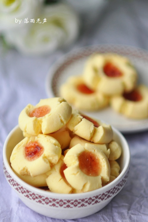 及以下步骤:取出冷藏好的面团,取一小块,揉成若干小圆球。 将小圆球放在烤盘上,用大拇指按扁 按扁的时候,饼干会出现自然的裂纹。 将果酱装入裱花袋,在饼干中间挤上一点果酱 放入预热好的烤箱170度,20分钟左右 边缘稍黄即可出炉,冷却后密封保存。 按扁的时候,饼干会出现自然的裂纹。 将果酱装入裱花袋,在饼干中间挤上一点果酱 放入预热好的烤箱170度,20分钟左右 边缘稍黄即可出炉,冷却后密封保存。