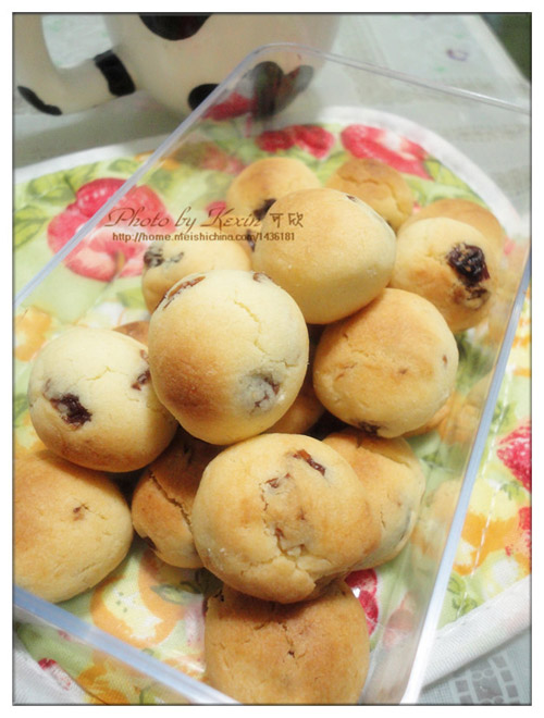 及以下步骤:继续倒入切好葡萄干,用刮刀,翻拌加入低粉的黄油,翻拌均匀。 拌匀后,切成长条,分出大小相等的块,再用手团成酥球。 装入烤盘,酥球之间要预留出空隙。 烤箱170度,中层,上下火加热,根据酥球大小的不同,烘烤的时间也不同,以上材料,若分成20个左右,大约要烤20分钟,关火后,再用余温烘10分钟,若分成更多的球,就大约5分钟看一下烘烤的程度,适时关火,以免烤糊。 浓香的葡萄酥球出炉啦。火稍有点大,味道不错,酥软,酸甜,适合老人小孩。 继续倒入切好葡萄干,用刮刀,翻拌加入低粉的黄油,翻拌均匀。 拌匀后,切成长条,分出大小相等的块,再用手团成酥球。 装入烤盘,酥球之间要预留出空隙。 烤箱170度,中层,上下火加热,根据酥球大小的不同,烘烤的时间也不同,以上材料,若分成20个左右,大约要烤20分钟,关火后,再用余温烘10分钟,若分成更多的球,就大约5分钟看一下烘烤的程度,适时关火,以免烤糊。 浓香的葡萄酥球出炉啦。火稍有点大,味道不错,酥软,酸甜,适合老人小孩。
