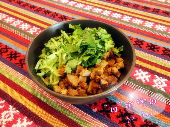 及以下步骤:6.把所有的料和米饭拌均匀就可以开吃啦o(∩_∩)o哈哈~ 1.前一晚先把肉切1厘米左右的片,放在容器里,加入烤肉腌料(调配好那种,我用的孜然味的),盐,水,拌匀,盖上盖子,放入冰箱冷藏。 2.第二天吃的时候从冰箱里拿出来,铺平放在烤盘上,烤箱预热后,上下火230度烤20分钟。 1.前一晚先把肉切1厘米左右的片,放在容器里,加入烤肉腌料(调配好那种,我用的孜然味的),盐,水,拌匀,盖上盖子,放入冰箱冷藏。 2.第二天吃的时候从冰箱里拿出来,铺平放在烤盘上,烤箱预热后,上下火230度烤20分钟。 3.烤好后,切成1厘米左右的丁。 4.黄瓜切丝,生菜切小块,香菜切碎。 5.碗里盛好米饭,上面铺上切好的各种料。 注意(不要盛太满哦,会不好拌哒~) 6.把所有的料和米饭拌均匀就可以开吃啦o(∩_∩)o哈哈~