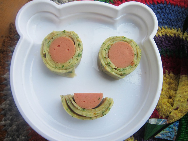 给煎饼里面加了果仁 和虾仁等,本来要直接是做个煎饼吃的,可是宝贝不干,不要吃,还要我给她里面在裹根香肠,然后却成花朵吃,哈哈,上次吃了一次,这又开始挑剔了