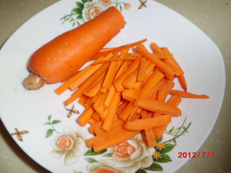 1、将胡萝卜洗净切成一寸长粗细如豇豆的条
