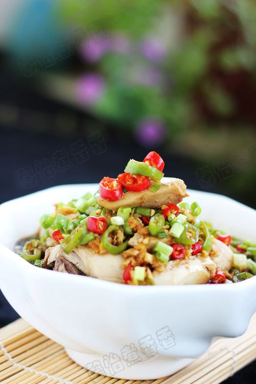 及以下步骤:红辣椒切成小圈 青辣椒切成小圈 切好的辣椒圈放一小碗内 先放一勺盐稍稍腌制几分钟,也可以不腌 然后加香醋与生抽浸泡辣椒,把辣椒的辣味完全释放出来 浸泡后的辣椒再加上花椒油,葱 蒜 姜,白糖,制成蘸水汁 过冰水浸泡后的兔腿捞出晾干水份后,切成块 装入一个较深的碗内 把调好的汁淋在切好的兔肉块上就可以上桌了 把调好的汁淋在切好的兔肉块上就可以上桌了