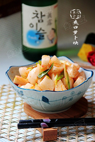 韩式小拌菜可是韩国家庭餐餐必备的华丽配角。 各种拌菜食材多样,清爽不油腻非常爽口。做法因季节和地域的不同而不同,种类繁多尤以发酵食品泡菜和酱类最为发达,已逐渐成为韩国人的骄傲。 此道爽口萝卜块,可以作为简易泡菜,不必发酵,拌好就可食用,非常的爽口开胃。
