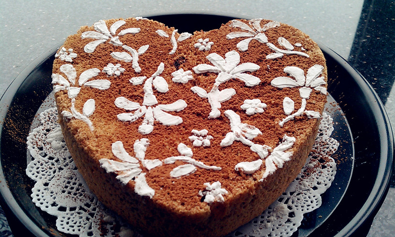 好久没有做戚风了,今天来一个可可戚风,临烤前又往里塞了几块巧克力,切开后内有乾坤,巧克力成软心喽,出炉脱模后筛上一层可可粉,再用糖粉筛上图形的,美。