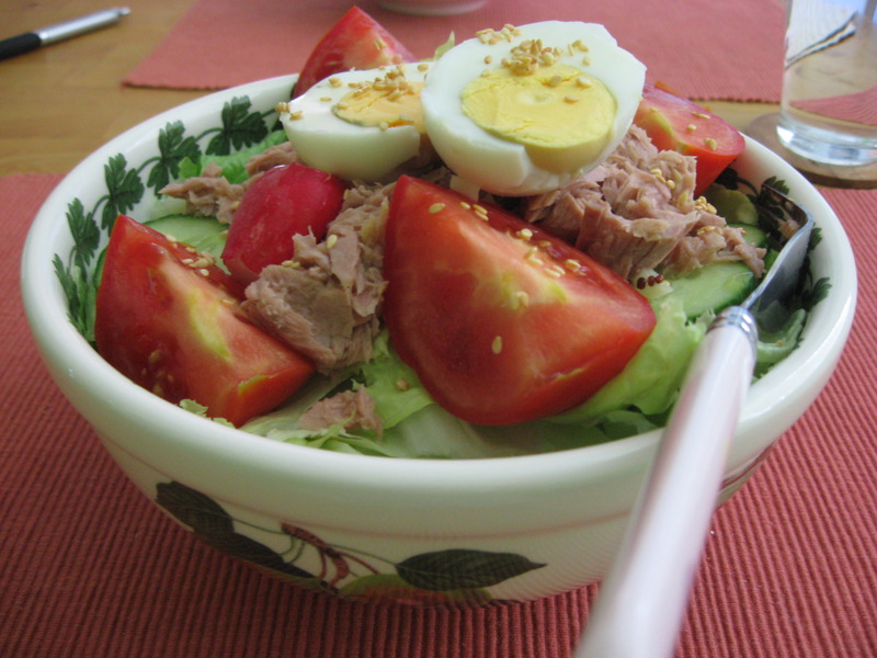 及以下步骤:蔬菜洗净、切成自己喜欢的形状,我是把生菜手撕成小片,萝卜对半切,黄瓜切片,番茄切成4瓣 大蒜切成末,油里炒至透明; 蔬菜洗净、切成自己喜欢的形状,我是把生菜手撕成小片,萝卜对半切,黄瓜切片,番茄切成4瓣 大蒜切成末,油里炒至透明; 蔬菜洗净、切成自己喜欢的形状,我是把生菜手撕成小片,萝卜对半切,黄瓜切片,番茄切成4瓣 大蒜切成末,油里炒至透明; 在玻璃杯中倒入2大勺橄榄油、4大勺醋、1大勺芥末,顺时针混合,使其变成均匀乳浊液,加入炒好的大蒜,继续混合乳浊液至均匀,此为沙拉的酱汁; 将酱汁均匀地淋在蔬菜上; 放上吞拿鱼 将事先煮好的鸡蛋,剥壳,并纵向一切好,排放在沙拉上,完成。