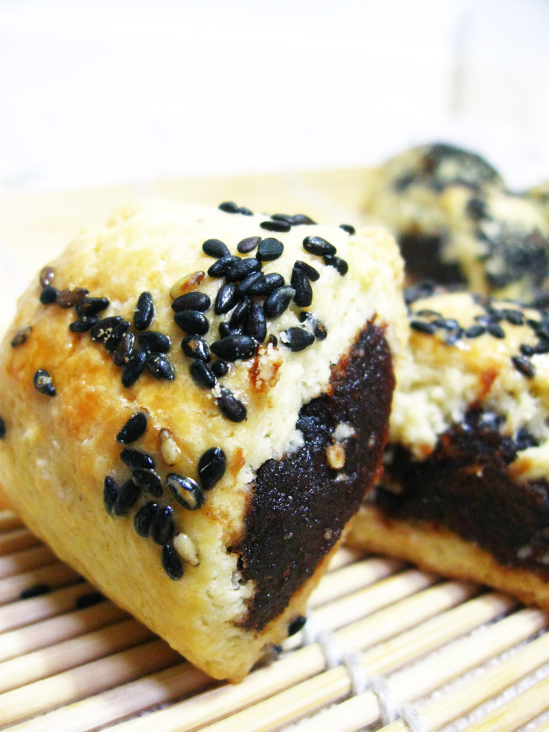 及以下步骤:包好的面团呈圆柱形长条 在长条表面刷一层蛋液,再撒上一层黑芝麻 用刀或刮刀把长条切成大小均匀的小段,烤箱中层180度25分钟左右,至表面金黄即可! 把面团放冰箱冷藏半小时左右取出 下面铺保鲜膜,把面团擀成长条 中间挤上一长条豆沙馅 借助保鲜膜,从一端把豆沙馅包起来 包好的面团呈圆柱形长条 在长条表面刷一层蛋液,再撒上一层黑芝麻 用刀或刮刀把长条切成大小均匀的小段,烤箱中层180度25分钟左右,至表面金黄即可!