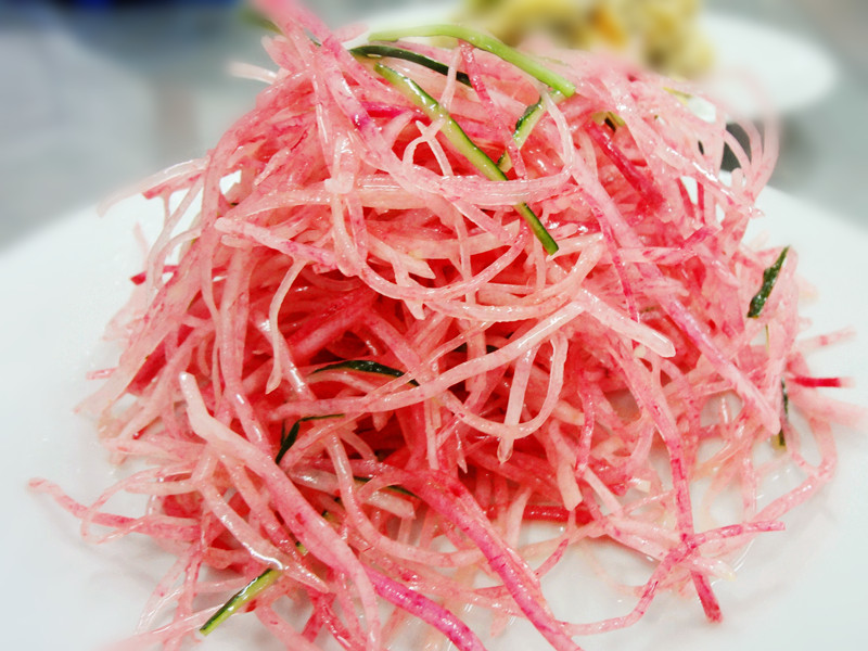 及以下步骤:加醋~ 加盐、糖~ 拌匀即食~ 切片 再切丝~ 将丝入冰水浸泡 捞出控水置盆内,加几丝其他颜色的蔬菜作点缀~ 加醋~ 加盐、糖~ 拌匀即食~