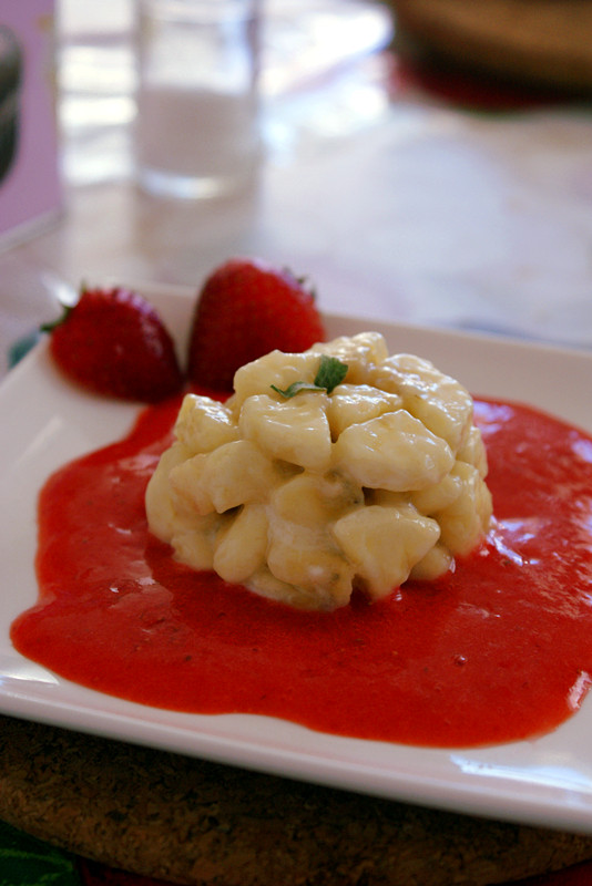 6、香蕉放入小容器中,用勺子压一压,倒扣在盘子上,然后在周围淋上一圈草莓汁,就大功告成了!