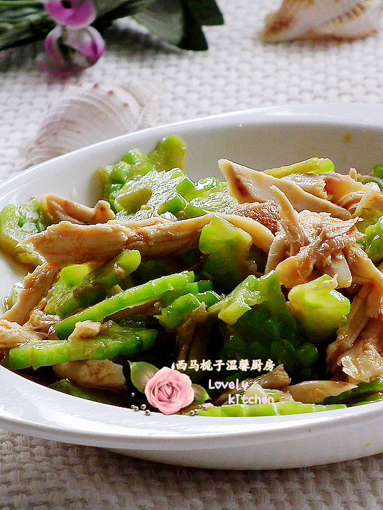 苦瓜成为我家夏季餐桌上的常见菜,也可以说是每天必备的一道菜。苦瓜搭配鸡肉是非常的融洽的,鸡肉的鲜香和苦瓜的清苦,使这道菜味道清爽鲜美,口感丰富。是一道降火排毒的减肥菜谱。和鸡肉拌食又可促进营养吸收,一举两得 。 苦瓜的选购:苦瓜身上一粒一粒的果瘤,是判断苦瓜好坏的特征。颗粒愈大愈饱满,表示瓜肉愈厚;颗粒愈小,瓜肉相对较薄。选苦瓜除了要挑果瘤大、果行直立的,还要洁白漂亮,因为如果苦瓜出现黄化,就代表已经过熟,果肉柔软不够脆,失去苦瓜应有的口感。