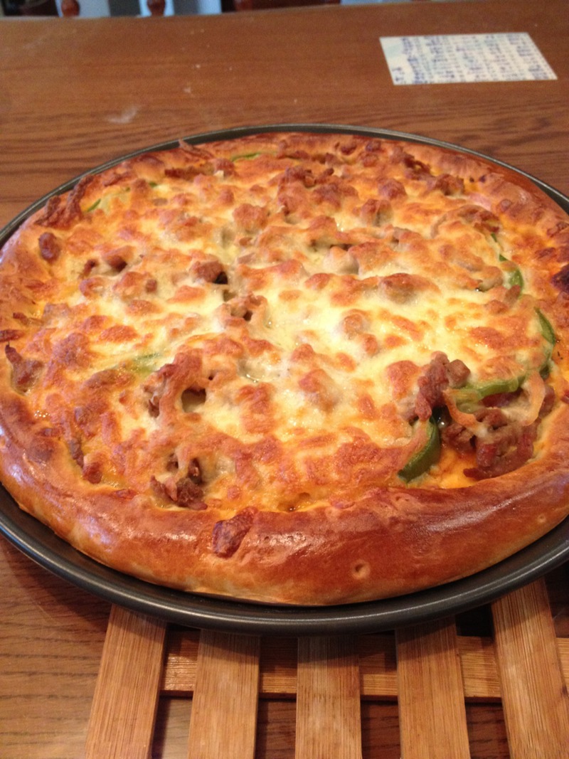 及以下步骤:将青椒、洋葱切丝、焯水,滤干水分备用。梅花肉腌制好并煎熟。 将面粉、鸡蛋、酵母加适量清水,用面包机和面并发酵成2倍大,取出排气,松弛15分钟,杆成比披萨盘稍大的圆片 将青椒、洋葱切丝、焯水,滤干水分备用。梅花肉腌制好并煎熟。 将面粉、鸡蛋、酵母加适量清水,用面包机和面并发酵成2倍大,取出排气,松弛15分钟,杆成比披萨盘稍大的圆片 将青椒、洋葱切丝、焯水,滤干水分备用。梅花肉腌制好并煎熟。 将面粉、鸡蛋、酵母加适量清水,用面包机和面并发酵成2倍大,取出排气,松弛15分钟,杆成比披萨盘稍大的圆片 将青椒、洋葱切丝、焯水,滤干水分备用。梅花肉腌制好并煎熟。 将面粉、鸡蛋、酵母加适量清水,用面包机和面并发酵成2倍大,取出排气,松弛15分钟,杆成比披萨盘稍大的圆片 将青椒、洋葱切丝、焯水,滤干水分备用。梅花肉腌制好并煎熟。 将面饼铺在披萨盘上,均匀地刷上披萨酱,将蔬菜和肉均匀得铺在面饼上,撒上芝士,入预热220度烤箱,15分钟