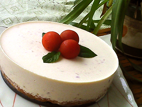 这道冻芝士没有加糖,用了某人齁齁甜的自制酸奶。小番茄是自家种的。用了上次做的玉米面天使蛋糕。玉米面的粗,与芝士蛋糕体的细腻同时在口中碰撞,很奇妙的感觉