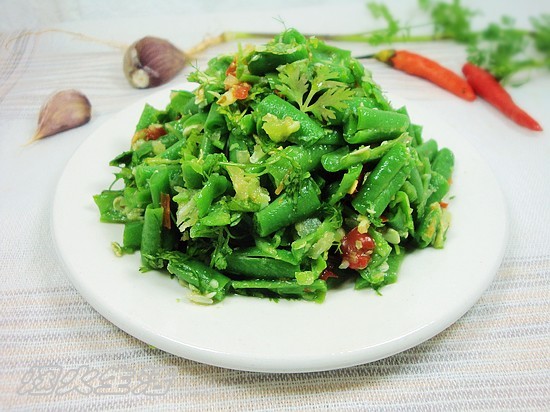 及以下步骤:成品图 豇豆去两边头及筋丝,并洗净。 豇工放沸水焯至断生。 豇豆去两边头及筋丝,并洗净。 豇工放沸水焯至断生。 焯熟豇豆切成小段,蒜去皮,辣椒、香菜洗净切段。 把蒜粒和辣椒放石臼里加入盐和味精舂成泥。 放入豇豆继续舂至散开。 放入香菜和适量生抽舂两下即可舀出来上桌。 成品图