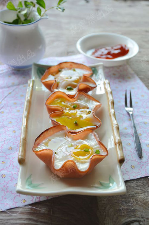 及以下步骤:准备材料:火腿片3块,鸡蛋3个,葱1条。 火腿片放入小模具中(蛋挞模要可以的)。 准备材料:火腿片3块,鸡蛋3个,葱1条。 火腿片放入小模具中(蛋挞模要可以的)。 准备材料:火腿片3块,鸡蛋3个,葱1条。 火腿片放入小模具中(蛋挞模要可以的)。 鸡蛋磕入火腿片里(尽量选小个鸡蛋,大的装不下)。 放入烤箱中层,上下火170度烤8分钟左右。注意观察,比烤糊了哦。 葱切碎,放小许生抽芝麻油拌一下。 烤好后撒上步骤5的调料即可。