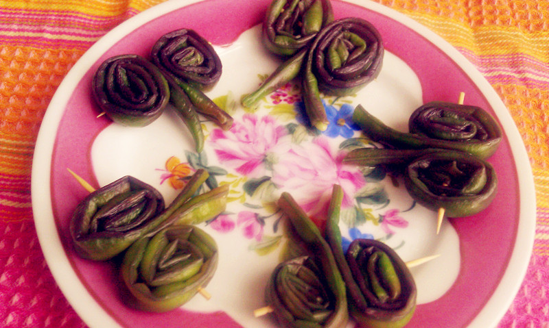 及以下步骤:另一根同样卷成卷反方向用刚才步骤5的豇豆卷牙签固定在一起。 豇豆蝴蝶做好了 同样做出更多的蝴蝶卷。 蒜切成蒜米和生抽、鸡精、香油调制成酱汁。 豇豆蝴蝶卷和碗汁一起摆盘上桌。 另一根同样卷成卷反方向用刚才步骤5的豇豆卷牙签固定在一起。 豇豆蝴蝶做好了 同样做出更多的蝴蝶卷。 蒜切成蒜米和生抽、鸡精、香油调制成酱汁。 豇豆蝴蝶卷和碗汁一起摆盘上桌。