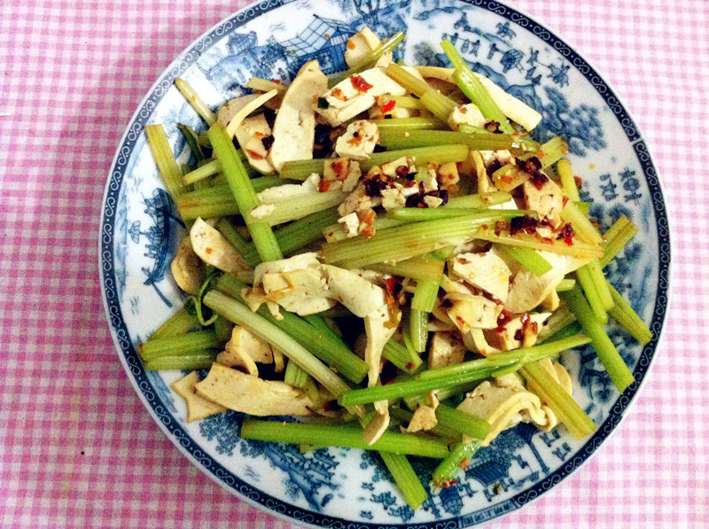及以下步骤:装盘,灰常的好吃哦,香油不要放太多,3滴就可以了,主要是为了满足鼻子! 豆干芹菜洗干净,切片! 切好的材料放在盘中,烧一锅水! 豆干芹菜洗干净,切片! 切好的材料放在盘中,烧一锅水! 水开后,放锅里滴入橄榄油!这是为了保持材料颜色! 水再次沸腾后,放入材料,待水起了很多小泡泡沸腾时,关火! 2分钟后,把材料捞出,滤水,放入凉白开水中冲一下,过掉水!冬天可以不用过凉白开! 取一干净的碗,把滤水后的材料放入碗中,先放入香油,这一步一定要是先放香油,再放入密制辣椒酱,少量盐,大蒜!用手颠动碗,不要用筷子搅拌,以免把香干弄碎 装盘,灰常的好吃哦,香油不要放太多,3滴就可以了,主要是为了满足鼻子!