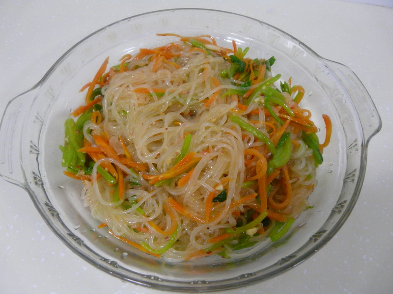 及以下步骤:胡萝卜洗净去皮,切成细丝。 炒锅放油烧热,下入胡萝卜丝,翻炒至断生,成盘备用。 胡萝卜洗净去皮,切成细丝。 炒锅放油烧热,下入胡萝卜丝,翻炒至断生,成盘备用。 胡萝卜洗净去皮,切成细丝。 炒锅放油烧热,下入胡萝卜丝,翻炒至断生,成盘备用。 菠菜洗净切段,只用茎部。煮锅放水,放少许盐和几滴色拉油,烧开。下入菠菜焯烫,然后用冷水冲凉,备用。 粉丝先用冷水泡软,煮锅放水烧开,下入粉丝煮熟,然后用冷水冲凉,备用。 把粉丝、胡萝卜丝、菠菜放入不锈钢盆中。加入调料:韩式辣酱、盐、味精、香油、白糖。 用手把调料和食材抓均即可。一定要用手啊。我个人认为这样拌出来的菜味道更好。